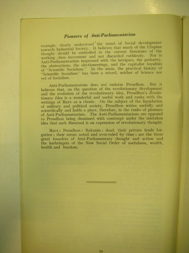 Anti-Parliamentarism does not endorse Proudhon. But it believes that, on teh question of the revolutionary development and the evolution of the revolutionary idea, Proudhon's Revolutionary Idea is a wonderful and useful work and ranks with the writings of Marx as a classic. On the subject of the liquidation of military and political society, Proudhon writes usefully and scientifically and holds a place, therefore, in the ranks of pioneers of Anti-Parliamentarism. The Anti-Parliamentarins are opposed to Proudhon being dismissed with contempt under the mistaken idea that such dismissal is an expression of revolutionary thought.