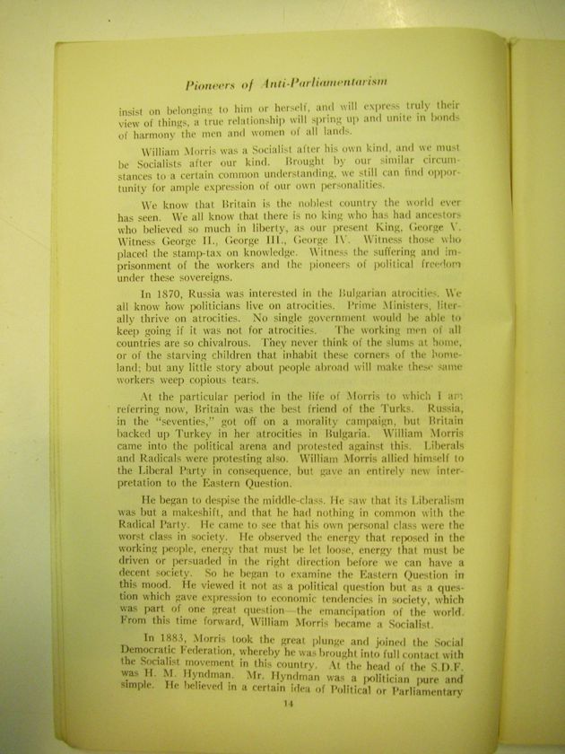 At the particular period in the life of Morris to which I am referring now, Britain was the best friend of the Turks, Russia, in the "seventies," got off on a morality campaign, but Britain banked up Turkey in her atrocities in Bulgaria. William Morris came into the political arena and protested against this. Liberals and Radicals were protesting also. William Morris allied himself to the Liberal Party in consequence, but gave an entirely new interpretation to the Eastern Question.