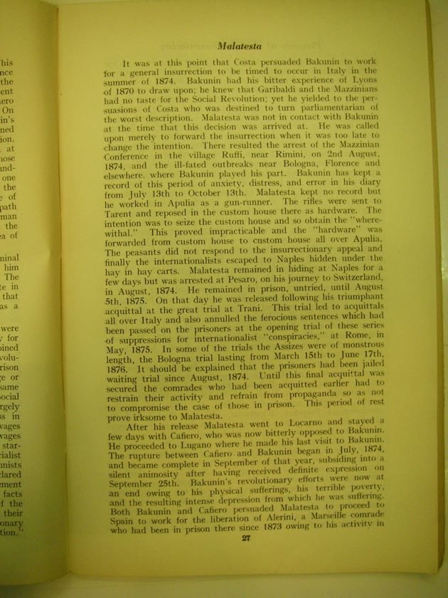 It was at this point that Costa persuaded Bakuinin to work for a general insurrection to be times to occur in Italy in the summer of 1874. Bakunin had his better experience of Lyons of 1870 to draw upon; he knew that Garibaldi and the Mazzinians has no taste for the Social Revolution; yet he yielded to the persuasions of Costa who was destined to turn parliamentarism of the worst description. Malatesta was not in contact with Bakunin at the time that this decision was arrived at. He was called upon merely to forward the insurrection when it was too late to change the intention. There resulted the arrest of the Mazzinian Conference in the village Ruffi, near Rimini, on 2nd August, 1874, and the ill-fated outbreaks near Bologna, Florence and elsewhere, where Bakunin played his part. Bakunin has kept a record of this period of anxiety, distress, and error in his diary from July 13th to October 13th. Malateta kept no record but he worked in Apulia as a gun-runner. The rifles were sent to Tarent and reposed in the custom house there as hardware. The intention was to seize the custom house and so obtain the "where- withal." This proved impracticable and the "hardware" was forwarded from custom house to custom house all over Apulia. The peasants did not respond to the insurrectionary appeal and finally the internationalists escaped to Naples hidden under the hay in hay carts. Malatesta remained in hiding at Naples for a few days but was arrested at Pesaro, on his journey to Switzerland, in August, 1874. He remained in prison, untried, until August 5th, 1875. On that day he was released following his triumphant acquittal at the great trial at Trani. This trial led to acquittals al over Italy and also annulled the ferocious sentences which had been passed on the prisoners at the opening trial of these series of suppressions for internationalist "conspiracies," at Rome, in May, 1875. In some of the trials the Assizes were of monstrous length, the Bologna trial lasting from March 15th to June 17th, 1876. It should be explained that the prisoners had been jailed waiting trial since August, 1874. Until the final acquittal was secured the comrades who had been acquitted earlier had to restrain their activity and refrain from propaganda so as not to compromise the case of those in prison. This period of rest prove irksome to Malatesta.