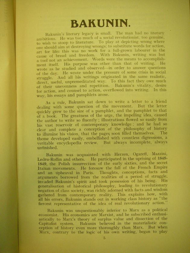 Bakunin's literary legacy is small. The man had no literary ambitions. he was too much of a social revolutionist, too genuine, to wish to stoop to literature. to play at depicting wrong where one should at at destroying wrongs; to substitute words for action, art for life: this was no work for a full-grown labourer in the cause of bread and freedom. With Bakunin, writing was but a tool not an achievement. Words were the means to accomplishment itself. His purpose was other than that of writing. He wrote as he studied and observed - in order to answer questions of the day. He wrote under the pressure of some crisis in social struggle. And all his writings originated in the same realistic, direct, useful, unpremeditated way. To this fact they owe much of their unevenness and repetition. Bakunin's vitality, desire for action, and counsel to action, overflowed into writing. in this way, his essays and pamphlets arose.
