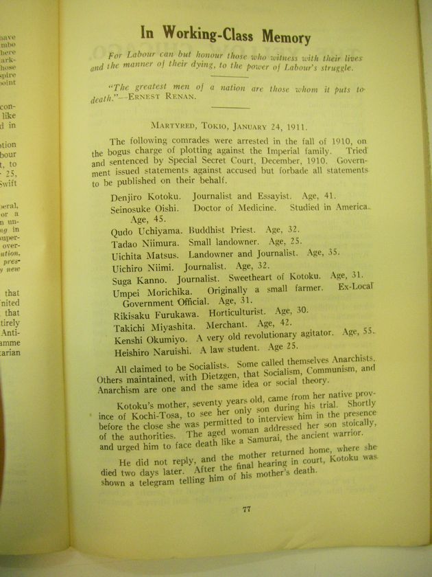 He did not reply, and the mother returned home, where she died two days later. After the final hearing in court, Kotoku was shown a telegram telling him of his mother's death.