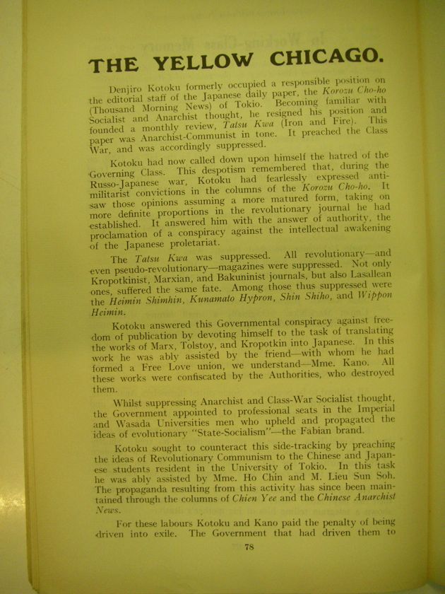 Denjiro Kotoku formerly occupied a responsible position on the editorial staff of the Japanese daily paper, the Korozu Cho-ho (Thousand Morning News) or Tokio. Becoming familiar with Socialist and Anarchist thought, he resigned his position and founded a monthly review, Tatsu Kwa (Iron and Fire). This paper was Anarchist-Communist in tone. It preached the Class War, and was accordingly suppressed.