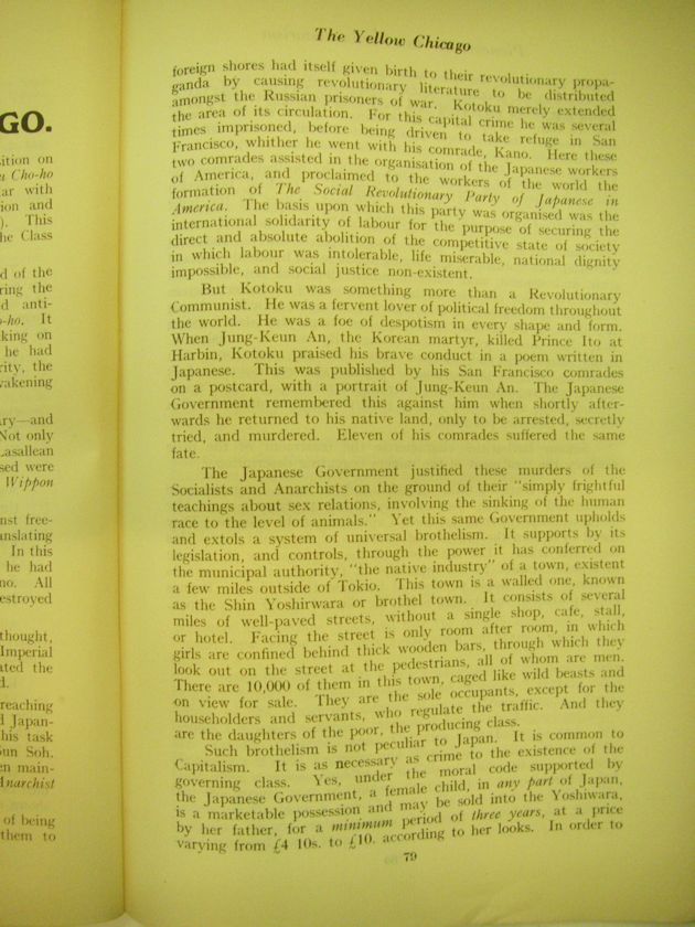 The Japanese Government justified these murders of the Socialists and Anarchists on the ground of their "simply frightful teachings about sex relations, involving the sinking of the human race to the level of animals." Yet this same Government upholds and extols a system of universal brothelism. It supports by its legislation, and controls, through the power it has conferred on the municipal authority, "the native industry" of a town, existent a few miles outside of Tokio. This town is a walled one, known as the Shin Yoshirwara or brothel town. It consists of several miles of well-paved streets, without a single shop, cafe, stall, or hotel. Facing the street is only room after room, in which girls are confined behind thick wooden bars, through which they look out on the street at pedestrians, all of whom are men. There are 10,000 of them in this town, caged like wild beasts and on view for sale. They are the sole occupants, except for the householders and servants, who regulate the traffic. And they are the daughters of the poor, the producing class.