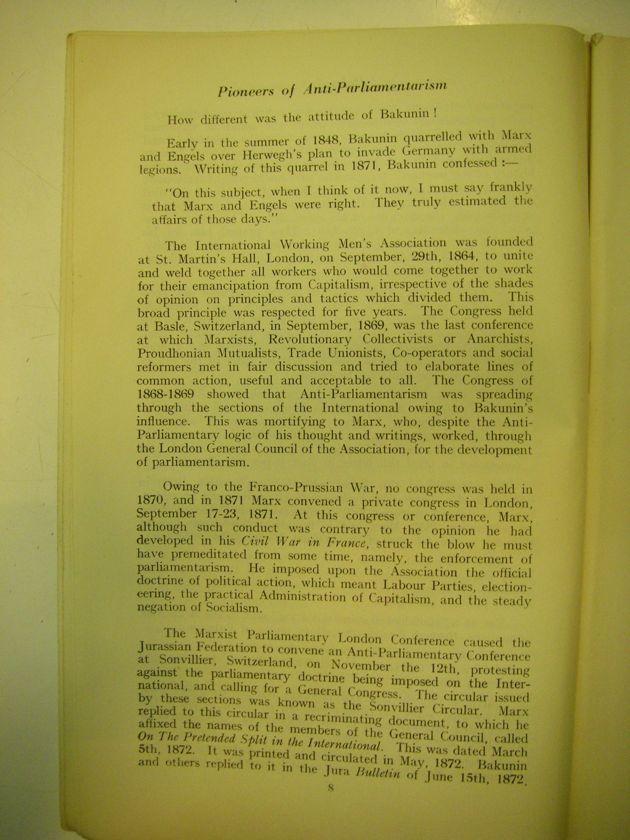 The International Working Men's Association was founded at St. Martin's Hall, London, on September, 29th, 1864, to unite and weld together all workers who would come together to work for their emancipation from Capitalism, irrespective of the shades of opinion on principles and tactics which divide them. this broad principle was respected for five years. The Congress held at Basle, Switzerland, in September, 1869, was the last conference at which Marxists, Revolutionary Collectivists or Anarchists, Proudhonian Mutualists, Trade Unionists, co-operators or social reformers met in fair discussion and tried to elaborate lines of common action, useful and acceptable to all. The congress of 1868-1869 showed that Anti-Parliamentarism was spreading through the sections of the International owing to Bakunin's influence. This was mortifying to Marx, who, despite the Anti- Parliamentary logic of his thought and writings, worked, through the London General Council of the Association, for the development of Parliamentarism.
