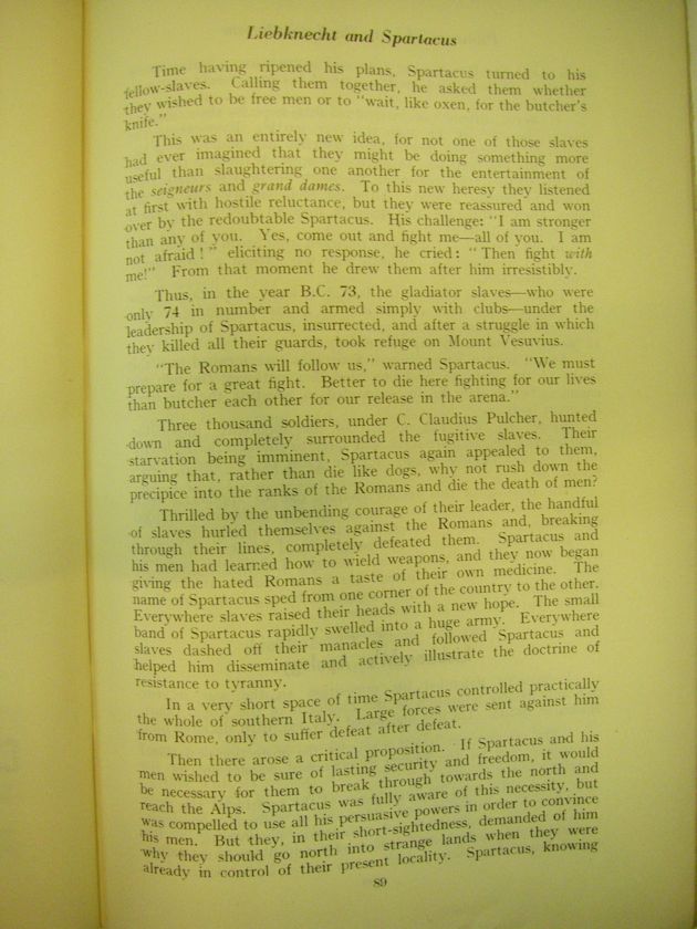 this was an entirely new idea, for not one of those slaves had ever imagined that they might be doing something more useful than slaughtering one another for the entertainment of the seigneurs and grand dames. To this new heresy they listened at first with hostile reluctance, but they were reassured and won over by the redoubtable Spartacus. His challenge: "I am stronger than any of you. Yes, come out and fight me--all of you. I am not afraid!" eliciting no response he cried: "Then fight with me!" From that moment he drew them after him irresistibly.