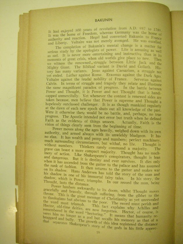 The completion of Bakunin's mental change is a matter for serious study by the apologists of power. Life is amusing as well as sad. It is never more entertaining and instructive than in its moments of great crisis, when old worlds give place to new. Then we witness the renowned struggle between Little Jack and the Mighty Giant. The Biblical variant is David and Goliath. History has many variants. Jesus against Caesarism, a struggle not yet ended. Luther against Rome. Erasmus against the Dark Ages. Voltaire against the feudal nobility of France. Servetus against Calvin. In terms of struggle and tragedy they relate and illustrate the same magnificent paradox of progress. In the battle between Power and Thought, it is Power and not Thought that is handicapped unmercifully. Yet whenever the contest is renewed sides are taken because men believe that Power is supreme and Thought a hopelessly outclassed challenger. It is as though mankind regularly at the dawn of each new epoch shuts out all knowledge of the past. Were it otherwise there would be no battle, and, perhaps, no true progress. The Apostle intended not error but truth when he defined Faith as the evidence of things unseen. Actually, Faith is the vision of things clearly seen from the beginning of time.
