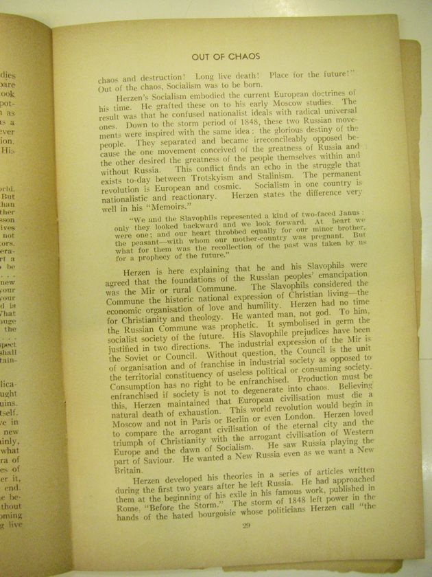 Herzen is here explaining that he and his Slavophils were agreed that the foundations of the Russian peoples' emancipation was the Mir or rural Commune. The Slavophils considered the Commune the historic national expression of Christian living - the economic organisation of love and humility. Herzen had not time for Christianity and theology. He wanted man, not god. To him, the Russian Commune was prophetic. It symbolised in germ the socialist society of the future. His Slavophile prejudices have been justified in two directions. The industrial expression of the Mir is the Soviet or Council. Without question, the Council is the unit of organisation and of franchise in industrial society as opposed to the territorial constituency of useless political or consuming society. Consumption has no right to be enfranchised. Production must be enfranchised if society is not to degenerate into chaos. Believing this, Herzen maintained that European civilisation must die a natural death of exhaustion.This world revolution would begin in Moscow and not in Paris or Berlin or even London. Herzen loved to compare the arrogant civilisation of the eternal city and the triumph of Christianity with the arrogant civilisation of Western Europe and the dawn of Socialism. He saw Russia playing the part of Saviour. He wanted a New Russia even as we want a New Britain.