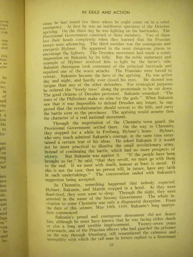 he had found few there whom he could count on in a rebel emergency. At first he was an indifferent spectator of the Dresden uprising. On the third day he was fighting on the barricades. The Provisional Government consisted of three members. Two of these lost their heads completely when they learned that the Prussian troops were advancing. The third member was the courageous and energetic Hybner. He appeared in the most dangerous places to encourage the fighters. The Dresden movement had made a comic impression on Bakunin by its folly. But the noble endurance and example of Hybner resolved him to fight by the latter's side. Bakunin thereupon took command of the principal barricade and repulsed one of the worst attacks. The Prussians were forced to retreat. Bakunin became the hero of the uprising. He was active day and night, and hardly ever closed his eyes. He showed less fatigue than any of the other defenders. For strategical purposes he ordered the "lovely tress" along the promenade to be cut down. The good citizens of Dresden protested. Bakunin remarked: "The tears of the Philistines make no wine for the gods." When Bakunin saw that it was impossible to defend Dresden any longer, he suggested that the revolutionaries should retreat to the hills, and carry the battle over to the provinces. The uprising would assume then the character of a real national movement.