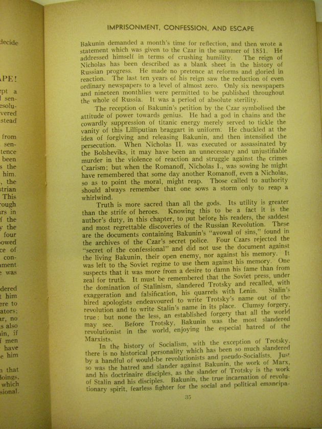 Truth is more sacred than all the gods. Its utility is greater than the strife of heroes. Knowing this to be a fact it is the author's duty, in this chapter, to put before his readers the saddest and most regrettable discoveries of the Russian Revolution. These are the documents containing Bakunin's "avowal of sins," found in the archives of the Czar's secret police. Four Czars, rejected the "secret of the confessional" and did not use the document against the living Bakunin, their open enemy, nor against his memory. It was left to the Soviet regime to use them against his memory. One suspects that it was more from a desire to damn his fame than from zeal for truth. It must be remembered that the Soviet press, under the domination of Stalinism, slandered Trotsky and recalled, with exaggeration and falsification, his quarrels with Lenin. Stalin's hired apologists endeavoured to write Trotsky's name out of the revolution and to write Stalin's name in its place. Clumsy forgery, true: but none the less, an established forgery that all the world may see. Before Trotsky, Bakunin was the most slandered revolutionist in the world, enjoying the especial hatred of the Marxists.