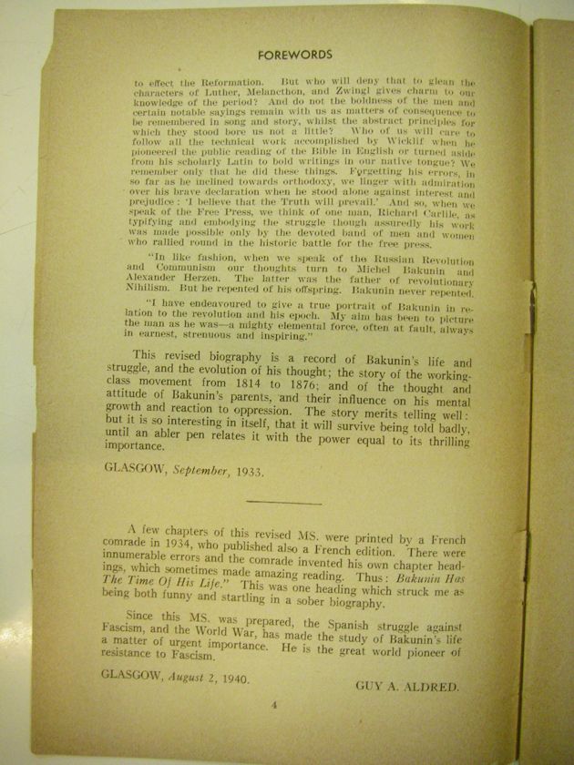 A few chapters of this revised MS. were printed by a French comrade in 1934, who published also a French edition. There were innumerable errors and the comrade invented his own chapter headings, which sometimes made amazing reading. Thus: Bakunin Has The Time Of His Life." This was one heading which struck me as being both funny and startling in a sober biography.