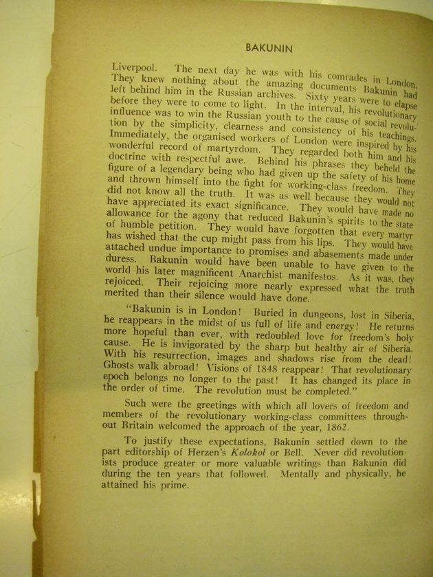 Liverpool. The next day he was with his comrades in London. They knew nothing about the amazing documents Bakunin had left behind him in the Russian archives. Sixty years were to elapse before they were to come to light. In the interval, his revolutionary influence was to win the Russian youth to the cause of social revolution by the simplicity, clearness and consistency of his teachings. Immediately, the organised workers of London were inspired by his wonderful record of martyrdom. They regarded both him and his doctrine with respectful awe. Behind his phrases they beheld the figure of a legendary being who had given up the safety of his home and thrown himself into the fight for working-class freedom. They did not know all the truth. It was as well because they would not have appreciated its exact significance. They would have made no allowance for the agony that reduced Bakunin's spirits to the state of humble petition. They would have forgotten that every martyr has wished that the cup might pass from his lips. They would have attached undue importance to promises and abasements made under duress. Bakunin would have been unable to have given to the world his later magnificent Anarchist manifestos. As it was, they rejoiced. Their rejoicing more nearly expressed what the truth merited than their silence would have done.