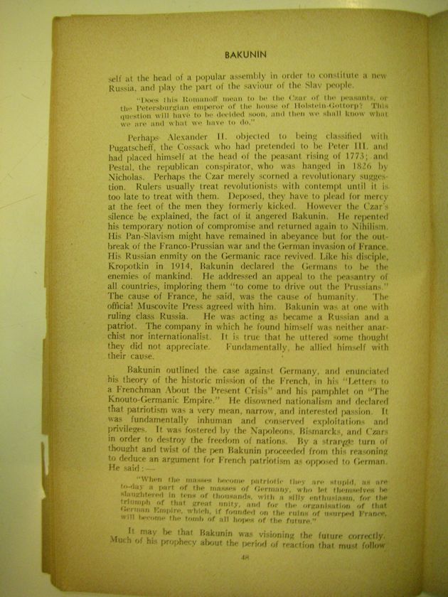 Perhaps Alexander II. objected to being classified with Pugatscheff, the Cossack who had pretended to be Peter III. and had placed himself at the head of the peasant rising of 1773; and Pestal, the republican conspirator, who was hanged in 1826 by Nicholas. Perhaps the Czar merely scorned a revolutionary suggestion. Rulers usually treat revolutionists with contempt until it is too late to treat with them. Deposed, they have to plead for mercy at the feet of the men the formerly kicked. However the Czar's silence be explained, the fact of it angered Bakunin. He repented his temporary notion of compromise and returned again to Nihilism. His Pan-Slavism might have remained in abeyance but for the outbreak of the Franco-Prussian war and the German invasion of France. His Russian enmity on the Germanic race revived. Like his disciple, Kropotkin in 1914. Bakunin declared the Germans to be the enemies of mankind. He addressed an appeal to the peasantry of all countries, "to come to drive out the Prussians." The cause of France, he said, was the cause of humanity. The offical Muscovite Press agreed with him. Bakunin was at one with ruling class Russia. He was acting as became a Russian and a patriot. The company in which he found himself was neither anarchist nor internationalist. It is true that he uttered some thought they did not appreciate. Fundamentally, he allied himself with their cause.