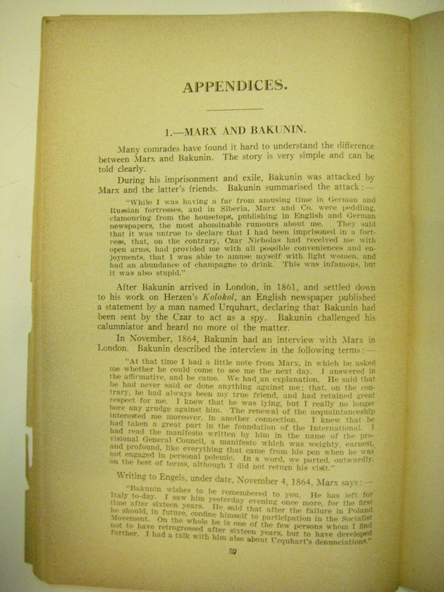 After Bakunin arrived in London, in 1861, and settled down to his work on Herzen's Kolokol , an English newspaper published a statement by a man named Urquhart, declaring that Bakunin challenged his calumniator and heard no more of the matter. In November, 1864, Bakunin had an interview with Marx in London. Bakunin described the interview in the following terms: -