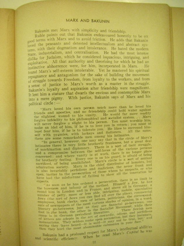 Ruhle points out that Bakunin endeavoured honestly to be on good terms with Marx and to avoid friction. He adds that Bakunin loved the peasants and detested intellectualism and abstract systems, with their dogmatism and intolerance. He hated the modern State, industrialism, and centralisation. He had the most intense dislike for Judaism, which he considered loquacious, intriguing, and exploitative. All that authority and theorising for which he had an instinctive abhorrence were, for him, incorporated in Marx. He found Marx's self-esteem intolerable. Yet he mastered his spiritual repugnance and antagonism for the sake of building the movement of struggle towards Freedom, from loyalty to the workers, and from a sense of justice to Marx's worth as a master in the struggle. Bakunin's loyalty and aspiration after friendship were magnificent. It lent him a stature that dwarfs the envious and contemptible Marx into a mere pigmy. With justice, Bakunin says of Marx and his political circle:-