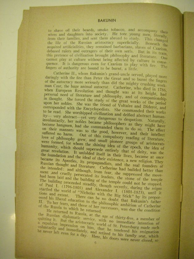 Catherine II., whom Bakunin's grand-uncle served, played more daringly with the fire than Peter the Great and so burnt the fingers of the autocracy more seriously than did the mighty crushing workman Czar, the huge animal autocrat. Catherine, who died in 1786, when European Revolution and thought was at its height, had personal need of literature and philosophy, and of companionship in thought. She forced the study of the great works of the period upon her nobles. She was the friend of Voltaire and Diderot, and corresponded with Encyclopedists. She commanded their works to be read. She worshipped civilization and deified abstract humanity- very abstract-yet very dangerous to despotism. Naturally, involuntarily, her nobles became philosophers as they might have become hangmen, had she commanded them to do so. The effect on their manners was to the good, however, and their intellect suffered no harm. Out of this compulsory reading of literature, love of philosophy grew, and small pioneer groups of aristocrats were formed, for whom the shining idea of the epoch, the idea of humanity, which should supersede entirely that of the deity, was the great revelation. It unfolded itself in their lives, became at once the foundation and the ideal of their existence, a new religion. They became its Apostles, its propagandists, and the real founders of Russian thought and literature. Catherine had builded better than she intended; and although, from fear, she suppressed the movement, and cruelly persecuted its leaders, the stone of the temple had been laid and the building of the temple could not be stopped. The building proceeded steadily, though secretly, during the reigns of Paul I. (1796-1801) and Alexander I. (1801-1825), until it startled the world of "Nicholas with the Big Stick" by its proportions and extent. There can be no doubt that Bakunin's father owed his liberal education to the philosophic ambition of Catherine II. To her fears, and those of her successors, was due the condition of Russia to which he returned.