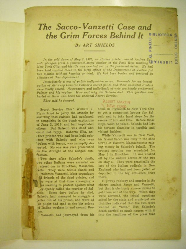 Highway robbery and murder is the charge against Sacco and Vanzetti, but that is obviously a mere device to get them out of the way. When they were arrested, the intial questions asked by the state and municipal authorities indicated that the two were wanted as "reds." But Salsedo's death carried so much nausea with it into the headlines of the press that