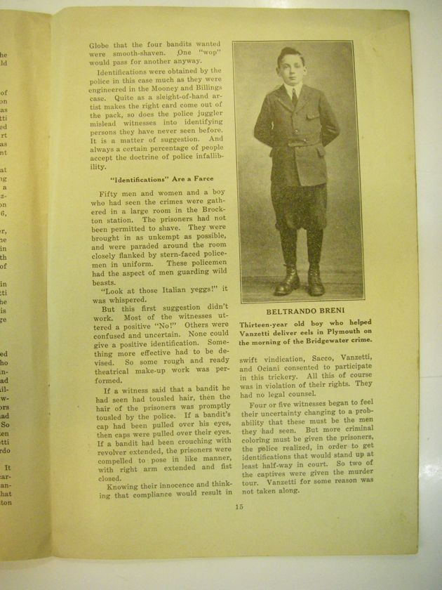 Four or five witnesses began to feel their uncertainty changing to a probability that these must be the men they had seen. But more criminal coloring must be given the prisoners, the police realized, in order to get identifications that would stand up at least half-way in court. So two of the captives were given the murder tour. Vanzetti for some reason was not taken along.