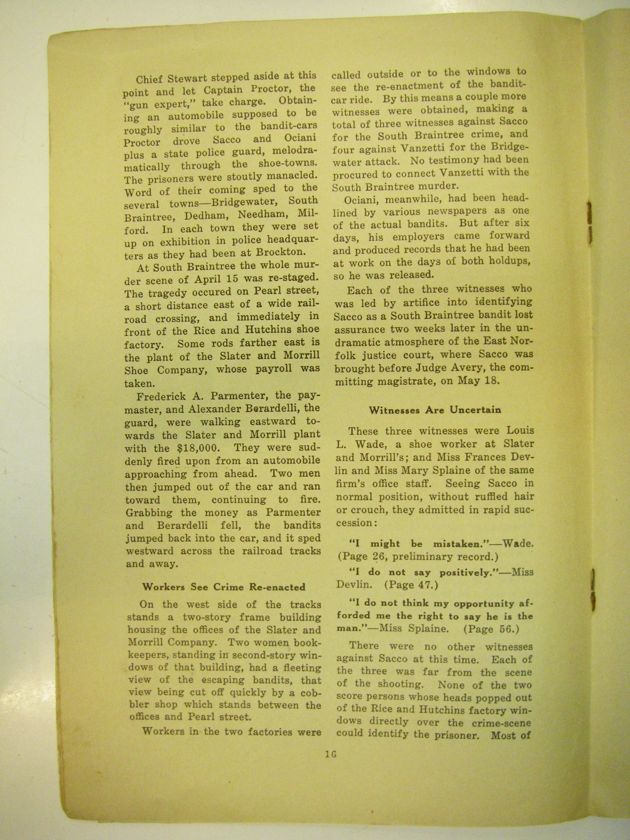 Workers in the two factories were called outside or to the windows to see the re-enactment of the bandit-car ride. By this means a couple more witnesses were obtained, making a total of three witnesses against Sacco for the South Braintree crime, and four against Vanzetti for the Bridgewater attack. No testimony had been procured to connect Vanzetti with the South Braintree murder.