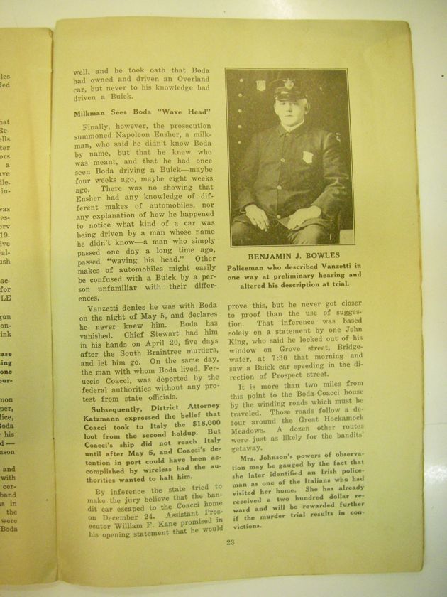 Vanzetti denies he was with Boda on the night of May 5, and declares he never knew him. Boda has vanished. Chief Stewart had him in his hands on April 20, five days after the South Braintree murders, and let him go. On the same day, the man with whom Boda lived, Feruccio Coacci, was deported by the federal authorities without any protest from state officials.
