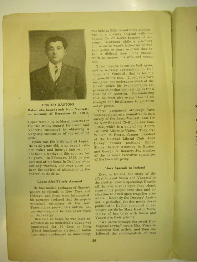 Even in Ireland, the story of the effort to send Sacco and Vanzetti to the electric chair is spreading. Despite all the woe that is upon that island, some of its people have time and inclination to dwell upon tragedies elsewhere. Recently the Drapers' Assistant, a periodical for dry goods clerks published in Dublin, contained an extensive article by Mary Heaton Vorse telling of her talks with Sacco and Vanzetti in their prisons.
