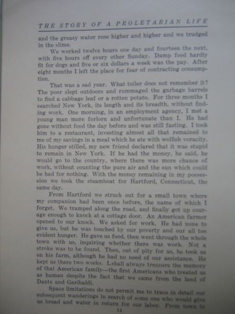 From Hartford we struck out for a small town where my companion had been once before, the name of which I forget. We tramped along the road, and finally for up courage enough to knock at a cottage door. An American farmer opened to our knock. We asked for work. He had none to give us, but he was touched by our poverty and our all to evident hunger. He gave us food, then went through the whole town with us, inquiring whether there was work. Not a stroke was to be found. Then, out of pity for us, he took us on his farm, although he had no need of our assistance. He kept us there two weeks. I.shall always treasure the memory of that American family -- the first Americans who treated us as human despite the fact that we came from the land of Dante and Garibaldi.