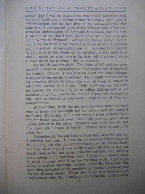 testify that I was an industrious, dependable workman, that my chief fault was in trying so hard to bring a little light to understanding into the dark lives of my fellow-workers. For some time I did manual work of the hardest kind in the construction undertakings of Sampson & Douland, for the city. I can almost say that I have participated in all the principle public works in Plymouth. Almost any Italian in the town or any of my foremen of my various jobs can attest my industry and modesty of life during this period. I was deeply interested by this time in the things of the intellect, in the great hope that animates me even here in the dark cell of a prison while I await death for a crime I did not commit.