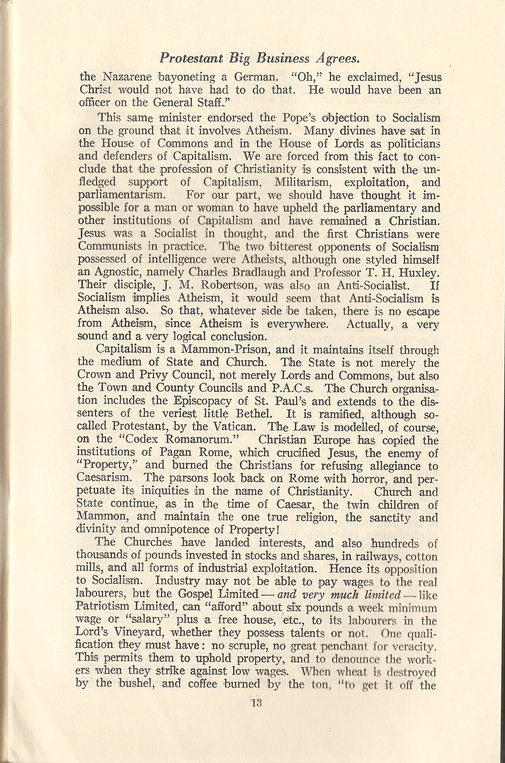 This same minister endorsed the Pope's objection to Socialism on the ground that it involves Atheism. Many divines have sat in the House of Commons and in the House of Lords as politicians and defenders of Capitalism. We are forced from this fact to conclude that the profession of Christianity is consistent with the unfledged support of Capitalism, Militarism, exploitation, and parliamentarism. For our part, we should have thought it impossible for a man or woman to have upheld the parliamentary and other institutions of Capitalism and have remained a Christian. Jesus was a Socialist in thought, and the first Christians were Communists in practice. The two bitterest opponents of Socialism possessed of intelligence were Atheists, although one styled himself an Agnostic, namely Charles Bradlaugh and Professor T. H. Huxley. Their disciple, J. M. Robertson, was also an Anti-Socialist. If Socialism implies Atheism, it would seem that Anti-Socialism is Atheism also. So that, whatever side be taken, there is no escape from Atheism, since Atheism is everywhere. Actually, a very sound and a very logical conclusion.