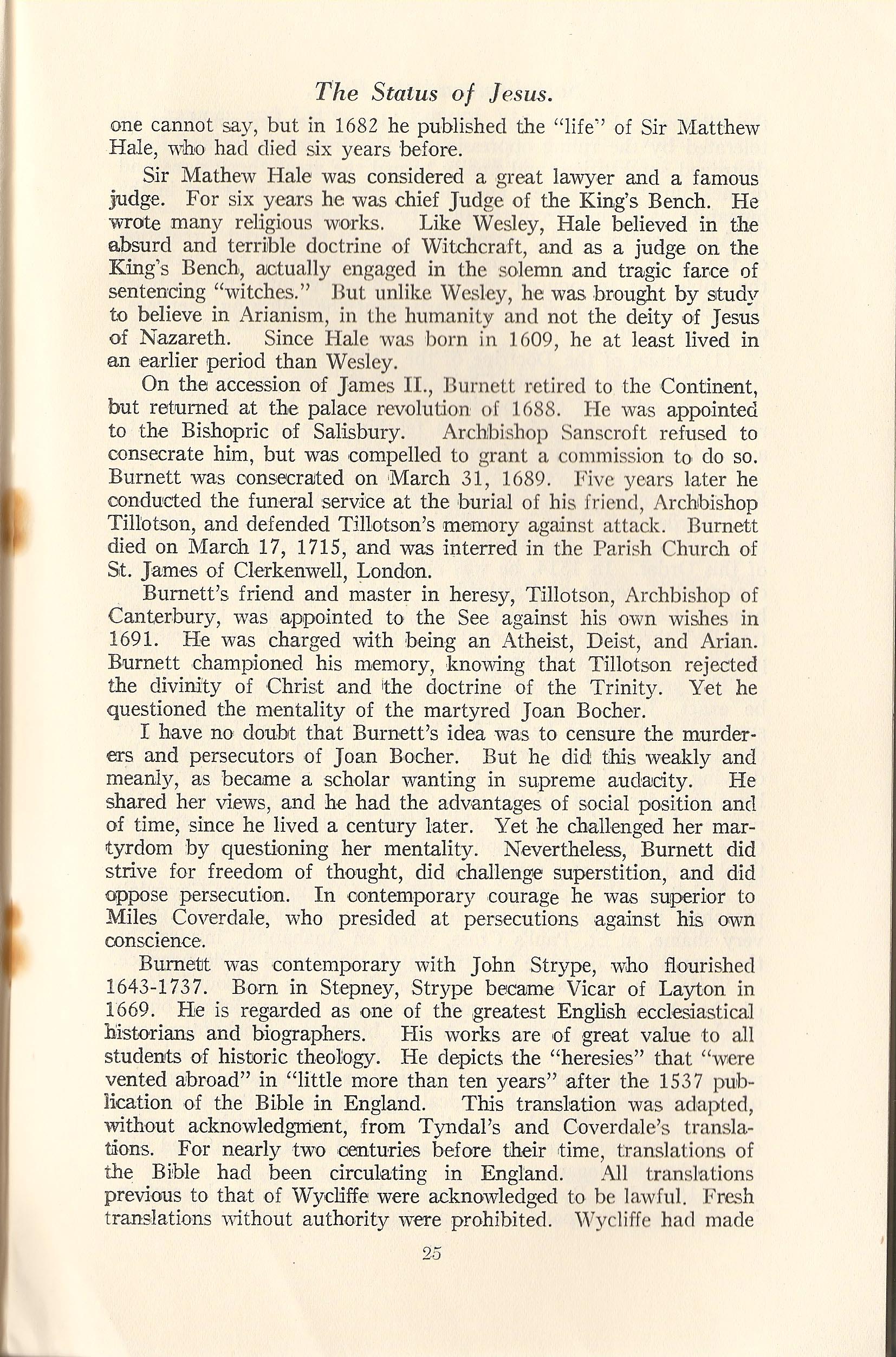 Sir Mathew Hale was considered a great lawyer and a famous judge. For six years he was chief Judge of the King's Bench. He wrote many religious works. Like Wesley, Hale believed in the absurd and terrible doctrine of Witchcraft, and as a judge on the King's Bench, actually engage in the solemn and tragic farce of sentencing "witches." But unlike Wesley, he was brought by study to believe in Arianism, in the humanity and not the deity of Jesus of Nazareth. Since Hale was born in 1609, he at least lived in an earlier period than Wesley.
