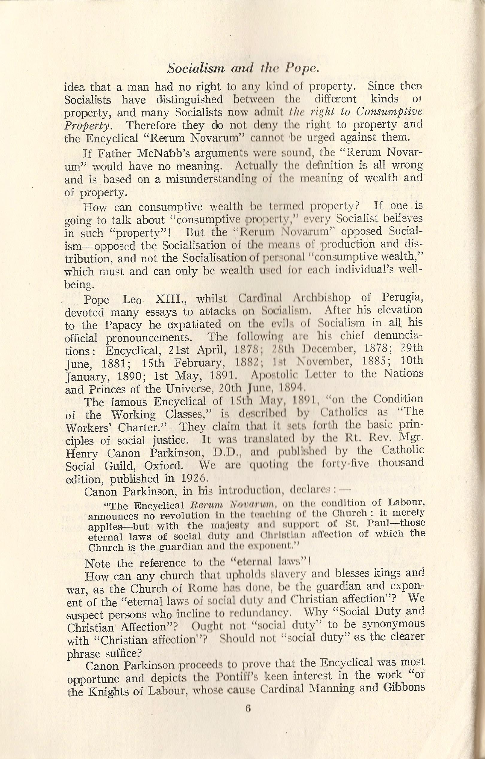 The famous Encyclical of 15th May, 1891, "on the Condition of the Working Classes," is described by Catholics as "The Workers' Charter." They claim that is sets forth the basic principles of social justice. It was translated by the Rt. Rev. Mgr. Henry Canon Parkinson, D.D., and published by the Catholic Social Guild, Oxford. We are quoting the forty-five thousand edition, published in 1926.