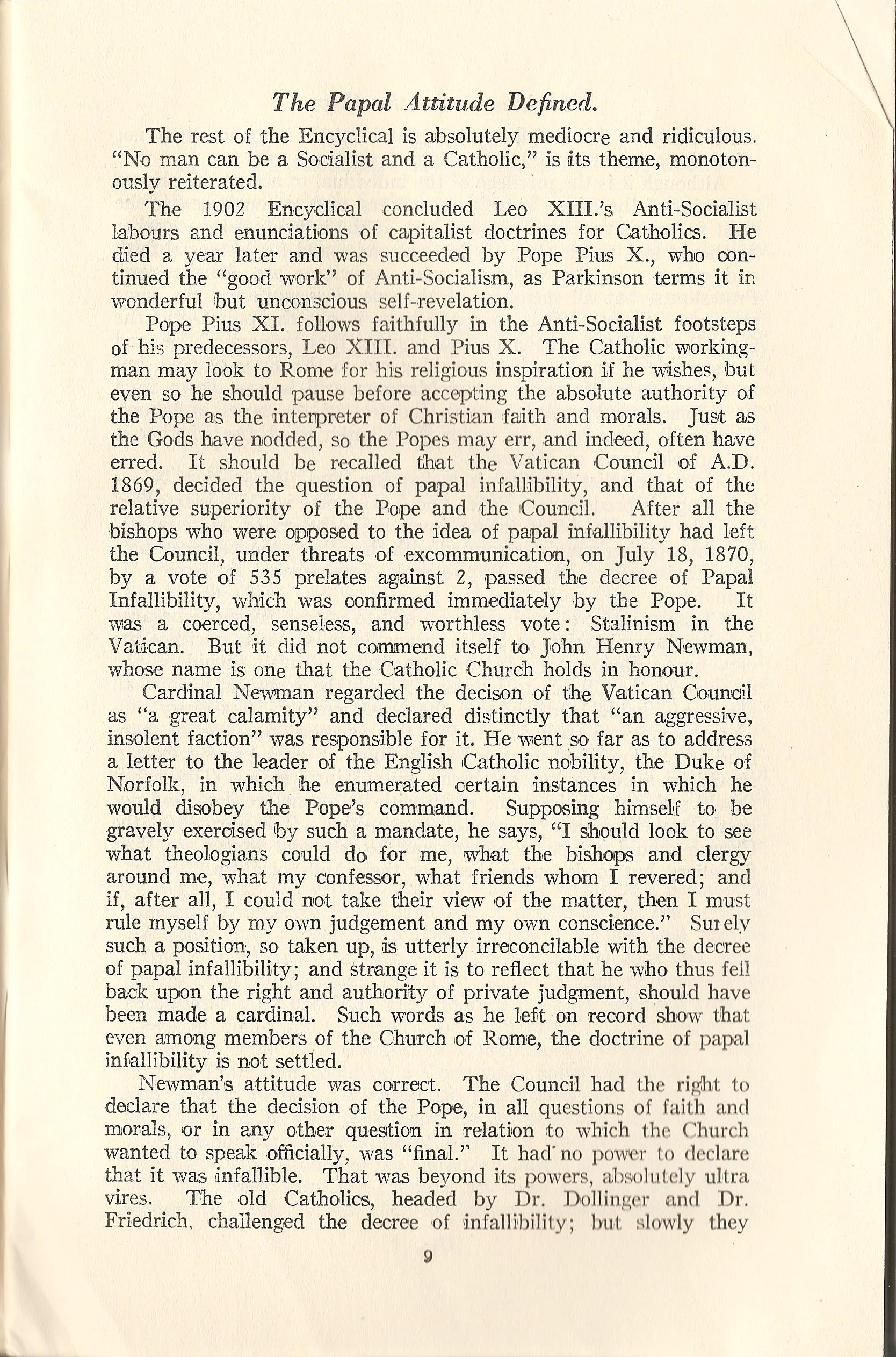 Pope Pius XI. follows faithfully in the Anti-Socialist footsteps of his predecessors, Leo XIII. and Pius X. The Catholic working-man may look to Rome for his religious inspiration if he wishes, but even so he should pause before accepting the absolute authority of the Pope as the interpreter of Christian faith and morals. Just as the Gods have nodded, so the Popes may err, and indeed, often have erred. It should be recalled that the Vatican Council of A.D. 1869, decided the question of papal infallibility, and that of the relative superiority of the Pope and the Council. After all the bishops who were opposed to the idea of papal infallibility had left the Council, under threats of excommunication, on July 18, 1870, by a vote of 535 prelates against 2, passed the decree of Papal Infallibility, which was confirmed immediately by the Pope. It was a coerced, senseless, and worthless vote: Stalinism in the Vatican. But it did not commend itself to John Henry Newman, whose name is one that the Catholic Church holds in honour.