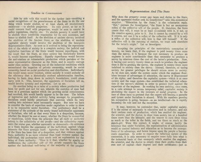 Accepting the principles of the materialistic conception of history, we learn that, if the engineer is paid twenty times more than the navvy, it is because the cost necessary to produce an engineer is more considerable than that necessary to produce a navvy by nineteen times the cost of the latter's production. Now, it having cost society twenty times as much to produce the engineer than it did to produce the navvy, the engineer is twenty times more indebted to society than the navvy. Instead, therefore, of taxing society for greater privileges he should return more to society. As he does not, under the system under which the engineer flourishes because of advantages of education, the navvy is dispossessed of his rights; and therefore the capitalist system—which is at once society and the wage system—has established the technical education of the navvy's children in order to protect itself against the expertism of the engineer. In working its own undoing, once more, in a vain attempt to secure temporary relief, capitalist society is abolishing the expert in the interests of social progress. In the face of these facts to pretend that the expert will become a parasite and tyrant under Socialism is absurd. With his numbers growing his occupation is going, because—as an intellectual—he is rapidly becoming the rule and not the exception.