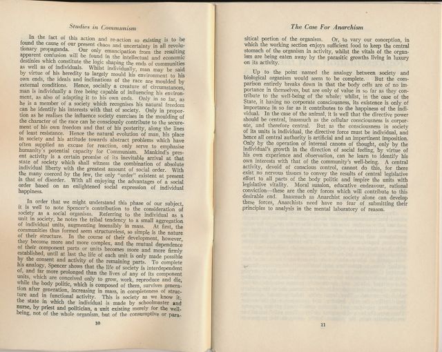 Up to the point named the analogy between society and biological organism would seem to be complete. But the comparison entirely breaks down in that the body cells are of no importance in themselves, but are only of value in so far as they contribute to the well-being of the whole; whilst, in the case of the State, it having no corporate consciousness, its existence is only of importance in so far as it contributes to the happiness of the individual. In the case of the animal, it is well that the directive power should be central, inasmuch as the cellular consciousness is corporate, and therefore central. But as the consciousness in society of its units is individual, the directive force must be individual, and hence all central authority is artificial and an impertinent imposition. Only by the operation of internal canons of thought, only by the individual's growth in the direction of social feeling, by virtue of his own experience and observation, can he learn to identify his own interests with that of the community's well-being. A central activity, devoid of conscious control, cannot do this, for there exist no nervous tissues to convey the results of central legislative effort to all parts of the body politic and inspire the units with legislative vitality. Moral suasion, educative endeavour, rational conviction—these are the only forces which will contribute to this desirable end. Inasmuch as Anarchist society alone can develop these forces, Anarchists need have no fear of submitting their principles to analysis in the mental laboratory of reason.