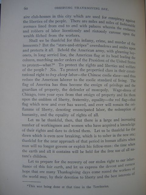Let us prepare for the recovery of our stolen right to our inheritance of this earth, and let us express the devout and earnest hope that ere many Thanksgiving days come round the workers of the world may, by their devotion to liberty and the best interest of