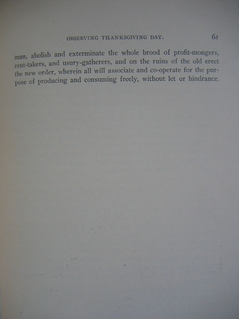 man, abolish and exterminate the whole brood of profit-mongers, rent-takers, and usury-gatherers, and on the ruins of the old erect the new order, wherein all will associate and co-operate for the purpose of producing and consuming freely, without let of hindrance.