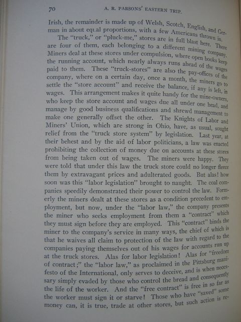 The "truck," or "pluck-me," stores are in full blast here. There are four of them, each belonging to a different mining company. Miners deal at these stores under compulsion, where open books keep the running account, which nearly always runs ahead of the wages paid to them. These "truck-stores" are also the pay-offices of the company, where on a certain day, once a month, the miners go to settle the "store-account" and receive the balance, if any is left, in wages. This arrangement makes it quite handy for the mine-owners, who keep the store account and wages due all under one head, and manage by good business qualification and shrewd management to make one generally offset the other. The Knights of Labor and Miners' Union, which are strong in Ohio, have, as usual, sought relief from the "truck store system" by legislation. Last year, at their behest and by the aid of labor politicians, a law was enacted prohibiting the collection of money due on accounts at these stores from being taken out of wages. The miners were happy. They were told that under this law the truck store could no longer fleece them by extravagant prices and adulterated goods. But alas! how soon was this "labor legislation" brought to naught. The coal companies speedily demonstrated their power to control the law. Formerly the miners dealt at these stores as a condition precedent to employment, but now, under the "labor law," the company presents the miner who seeks employment from them a "contract" which they must sign before they are employed. This "contract" binds the miner to company's service in many ways, the chief of which is that he waives all claim to protection of the law with regard to the companies paying themselves out of his wages for accounts run up at the truck stores. Alas for labor legislation! Alas for "freedom of contract;" the "labor law," as proclaimed in the Pittsburg manifesto of the International, only serves to deceive, and is when necessary simply evaded by those who control the bread and consequently the life of the worker. And the "free contract" is free in so far as the worker must sign it or starve! Those who have "saved" some money can, it is true, trade at other stores, but such action is re-