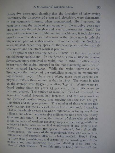 The speaker then took the census of 1880 in Ohio and deducted the following conclusions: In the State of Ohio in 1880 there were $47,000,000 more employed as capital than in 1870. In other words, in ten years the capital engaged in the manufacturing industries in Ohio increased $47,000,000. While the capital increased nearly $50,000,000 the number of the capitalists engaged in manufacturing decreased 2,070. There were 46,407 more wage-workers employed in 1880 in these industries in 1880 in these industries than in 1870. The wages in 1870 on the average were $357.62; in 1880, $334.18. Wages were reduced during these ten years 15 per cent.; the profits were 20 per cent greater. The number of manufacturers had decreased, the amount of capital invested had increased, and the wage-workers had increased nearly 50,000, thus proving that the rich are getting richer and the poor poorer. The number of those who are rich is decreasing, but the riches of the rich are constantly increasing. That is, he who five years ago was a millionaire is today worth ten millions, but where there were five millionaires five years ago, today there are only three. That is, the number of those who are driven to the necessity of working for daily wages is increasing, while the number of those who cannot find employment at any price is also increasing. These result, the speaker continues, from three different causes. The army of the unemployed, those who are kept in compulsory and enforced idleness, is being swelled. How? First, by labor saving machinery: and second, by the crowding out of the middle class, and destroying them, and dividing them into the class of wage-workers. Thus this army is being increased all the