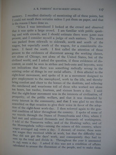 "When I was introduced I looked at the crowd and observed that it was quite a large crowd. I am familiar with public speaking and with crowds, and I should estimate there were 3,000 men present, and I consider myself a judge of such matters. The street was packed from sidewalk to sidewalk north and south of wagon, but especially south of the wagon, for a consider distance. I faced the south. I first called the attention of those present to the evidences of discontent among the working classes, not alone of Chicago, not alone of the United States, but of the civilized world, and I asked the question, if these evidences of discontent, as could be seen in strikes and lock-outs and boycotts, were not indications that there was something radically wrong in the existing order of things in our social affairs. I then alluded to the eight hour movement, and spoke of it as a movement designed to give employment to the unemployed, work to the idle, and thereby bring comfort and cheer to the homes of the destitute and relieving the unrelieved and wearisome toil of those who worked not alone ten hours, but twelve, fourteen, and sixteen hours a day. I said that the eight-hour movement was in the interests of civilization, of prosperity, of the public welfare, and that it was demanded by every interest in the community, and that I was glad to see them assembled on that occasion to give their voice in favor of the adoption of the eight-hour work-day. I then referred again to the general condition of labor throughout the country. I spoke of some of my travels through the States of Pennsylvania and Ohio, where I had met and addressed thousands and thousands of workingmen. I told of the Tuscarora Valley, and of the Hocking valley, and of the Monongahela valley—among the miners of this country, where wages averaged 24 ½ cents a day. I showed, of course, these were not wages they received at work, but that the difficulty was they did not get the days' work and consequently they had to sum up the total and divide it. Throughout the year it amounted to 24 ½ cents a day. I asked if this was not a condition of affairs calculated to arouse the discontent of the people, and to make them