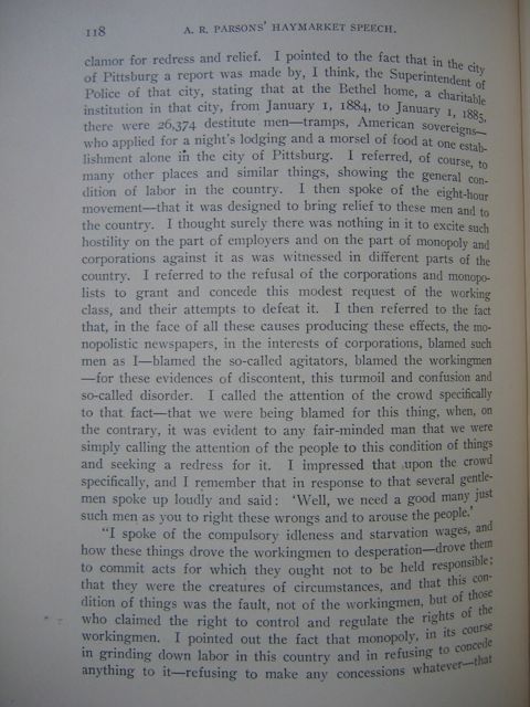 clamor for redress and relief. I pointed to the fact that in the city of Pittsburg a repot was made by, I think, the Superintendent of Police of that city, stating that at the Bethel home, a charitable institution in that city, from January 1, 1884, to January 1, 1885, there were 26,374 destitute men—tramps, American soverigns—who applied for a night's lodging and a morsel of food at one establishment alone in the city of Pittsburg. I referred, of course, to many other places and similar things, showing the general condition of labor in the country. I then spoke of the eight-hour movement—that it was designed to bring relief to these men and to the country. I thought surely there was nothing in it to excite such hostility on the part of employers and on the part of monopoly and corporations against it as was witnessed in different parts of the country. I referred to the refusal of the corporations and monopolists to grant and concede the modest request of the working class, and their attempts to defeat it. I then referred to the fact that, in the face of all these causes producing these effects the monopolistic newspapers, in the interests of corporations, blamed such men as I—blamed the so-called agitators, blamed the workingmen—for these evidences of discontent, this turmoil and confusion and so-called disorder. I called the attention of the crowd specifically to that fact—that we were being blamed for this thing, when, on the contrary, it was evident to any fair-minded man that we were simply calling the attention of the people to this condition of things and seeking a redress for it. I impressed that upon the crowd specifically, and I remembered that in response to that several gentlemen spoke up loudly and said: "Well, we need a good many just such men as you to right these wrongs and to arouse the people."