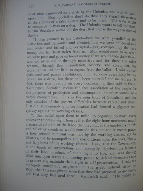 "I then called upon them to unite, to organize, to make every endeavor to obtain eight hours; that the eight-hour movement meant a peaceful solution of the labor trouble; that if the employers in this and all other countries would concede this demand if meant peace, if they refused it meant war, not by the working class, not by laborers, but the monopolists and corporations upon the lives, liberty and happiness of the working classes. I said that the Government, in the hands of corporations and monopoly, deprived the laborers of their labor product, of their right to live, and was driving labor into open revolt and forcing people to defend themselves and to protect and maintain their right to self-preservation. I said that the monopoly conspiracy originated in the great railroad strike of 1877; that this conspiracy since that time had proposed to use force, and that they had used force. Vanderbilt said: 'The public be