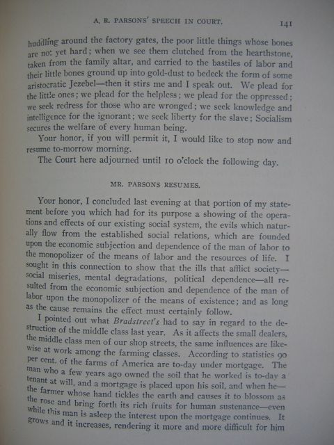 Your honor, I concluded last evening at that portion of my statement before you which had for its purpose a showing of the operations and effects of our existing social system, the evils which naturally flow from the established social relations, which are founded upon the economic subjugation and dependence of the man of labor to the monopolizer of the means of labor and the resources of life. I sought in this connection to show that the ills that afflict society—social miseries, mental degradations, political dependence—all resulted from the economic subjugation and dependence of the man of labor upon the monopolizer of the means of existence; and as long as the cause remains the effect must certainly follow.