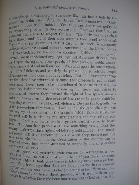 I have violated no law of this country. Neither I nor my colleagues here have violated any legal right of American citizens. We stand upon the right of free speech, of free press, of public assemblage, unmolested and undisturbed. We stand upon the constitutional right of self-defence, and we defy the prosecution to rob the people of America of these dearly bought rights. But the prosecution imagines that they have triumphed because they propose to put to death seven men. Seven men to be exterminated because they demand the right of free speech and exercise it. Seven men by this court are to be put to death because they claim their right of self-defence. Do you think, gentlemen of the prosecution, that you will have settled the case when you are carrying my lifeless bones to the potter's field? Do you think that this trial will be settled by my strangulation and that of my colleagues? I tell you that there is a greater verdict yet to be heard from. The American people will have something to say about this attempt to destroy their rights, which they hold sacred. The American people will have something to say when they understand this case, as to whether or not the Constitution of this country can be trampled under the foot at the dictation of monopoly and corporations and their hired tools.