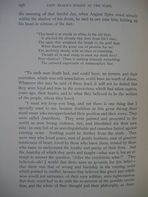 "I must not keep you long, and yet there is one thing that I specially want to say, because doubtless in this great throng there stand many who misapprehended their position and their views. They were called Anarchists. They were painted and presented to the world as men loving violence, riot, and bloodshed for their own sake; as men full of an unextinguishable and causeless hatred against existing order. Nothing could be further from the truth. They were men who loved peace, men of gentle instincts, men of gracious tenderness of heart, loved by those who knew them, trusted by those who came to understand the loyalty and purity of their lives. And the Anarchy of which they spoke and taught-what was it, but an attempt to answer the question, "After the revolution, what?" They believed-ah! I would that there were no grounds for this belief that there was that of wrong and hardship in the existing order which pointed to conflict, because they believed that greed and selfishness would not surrender, of their own volition, unto righteousness. But their creed had to do with the to-morrow of the possible revolution, and the whole of their thought and their philosophy, as Anar-