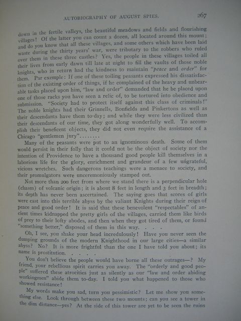 down in the fertile valleys, the beautiful meadows and flourishing villages! Of the latter you can count a dozen, all located around this mount; and do you know that all these villages, and some others which have been laid waste during the thirty year's war, were tributary to the robbers who ruled over them in these three castles? Yes, the people in these villages toiled all their lives from early dawn till late at night to fill the vaults of those noble knights, who in return had the kindness to maintain "peace and order" for them. Par example: If one of these toiling peasants expressed his dissatisfaction of the existing order of things, if he complained of the heavy and unbearable tasks placed upon him, "law and order" demanded that he be placed upon one of those racks you have seen a relic, to be tortured into obedience and submission. "Society had to protect itself against this class of criminals!" The noble knights had their Grinnells, Bonfields and Pinkertons as well as their descendants of our time, they got along wonderfully well. To accomplish their beneficent objects, they did not even require the assistance of Chicago "gentleman jury"...