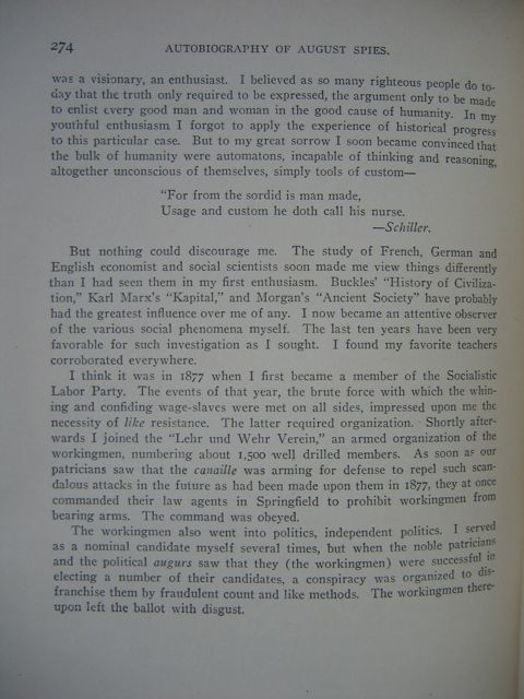 I think it was in 1877 when I first became a member of the Socialistic Labor Party. The events of that year, the brute force with which the whining and confiding wage-slaves were met on all sides, impressed upon me the necessity of like resistance. The latter required organization. Shortly afterwards I joined the "Lehr und Wehr Verein," an armed organization of the workingmen, numbering about 1,500 well-drilled members. As soon as our patricians saw that the canaille was arming for defense to repel such scandalous attacks in the future as had been made upon them in 1877, they at once commanded their law agents in Springfield to prohibit workingmen from bearing arms. The command was obeyed.