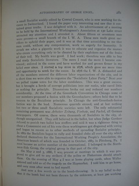 a small Socialist weekly edited by Conrad Conzett, who is working for the cause in Switzerland. I found the paper very interesting and saw that it contained great truths. I was delighted with it. An advertisement of a meeting to be held by the International Workingmen's Association at 130 Lake street attracted my attention and I attended it. About fifteen or seventeen men were present-a small branch of the I. W. A. These men made great sacrifices to uphold their paper, and it was at that time astonishing to me thin men could, without any compensation, work so eagerly for humanity. It struck me what a gigantic work it was to educate and organize the masse who create everything only to be cheated by their exploiters out of the fruits of their toil. My health was good. I had work; therefore was able to buy and study Socialistic literature. The more I read the more I became convinced; enlisted in the cause and have worked for and grown firmer in my belief ever since. I started a toy store in 1876, which gave me more time and opportunity to work for the cause. In 1878 the I. W. A. disbanded and all the members entered the different labor organization of the city and ill a short time we were able to organize the "Socialistic Labor Party." Next year we polled 12,000 votes for the labor candidates. This was a great success, but it brought a horde of corrupt politician into our ranks, who cared little or nothing for principle. Dissensions broke out and reduced our number considerably. At the time of the Greenback Convention in Chicago some of our members proposed a fusion with the Green backers; others held that to be treason to the Socialistic principle. In Chicago the anti-Greenback-fusion faction was in the lead. Numerous quarrels ensued, and at last nothing but two or three small Socialistic societies were left. The only substantial remaining permanent was Arbeiter Zeitung, Vorbote and FackeI, all German newspapers. Of course, there were thousands of Socialists in the city, although unorganized. They still believed in the ballot, but when Judge Gardener refused to punish two ballot box stuffers and said it was a righteous thing to cheat a Communist out of his vote these workingmen got disgusted with voting and began to reason as to other methods of spreading Socialist principle" In 1882 the Socialists began to rally and founded clubs all over the city which declared themselves for the International Working People's Association, the American branch of which was founded in October, 1883 in Pittsburg. Pa. I soon became an active member of the international. I belonged to the Northwest- Side Group the original group in that part of the city.
