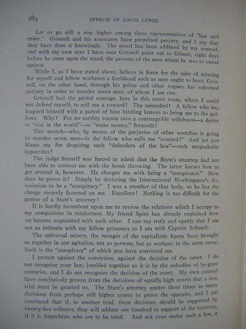 I protest against the conviction, against the decision of the court. I do not recognize your law, jumbled together as it is by the nobodies of by-gone centuries, and I do not recognize the decision of the court. My own counsel have conclusively proven from the decisions of equally high courts that a new trial must be granted us. The State's attorney quotes three times as many decisions from perhaps still higher courts to prove the opposite, and I am convinced that if, in another trial, these decisions should be supported by twenty-five volumes, they will adduce one hundred in support of the contrary. if it is Anarchists who are to be tried. And not even under such a law, a