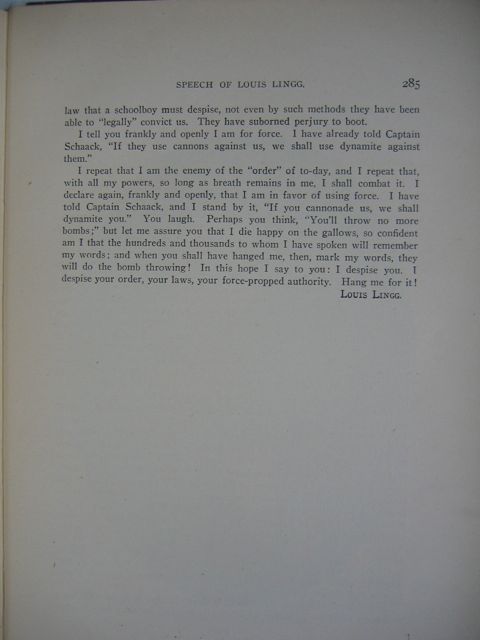 I repeat that I am the enemy of the "order" of to-day, and I repeat that, with all my powers, so long as breath remains in me, I shall combat it. I declare again, frankly and openly, that I am in favor of using force. I have told Captain Schaack, and I stand by it, "If you cannonade us, we shall dynamite you." You laugh. Perhaps you think, "You'll throw no more bombs;" but let me assure you that I die happy on the gallows, so confident am I that the hundreds and thousands to whom I have spoken will remember my words; and when you shall have hanged me, then, mark my words, they will do the bomb throwing! In this hope I say to you: I despise you. I despise your order, your laws, your propped authority. Hang me for it!