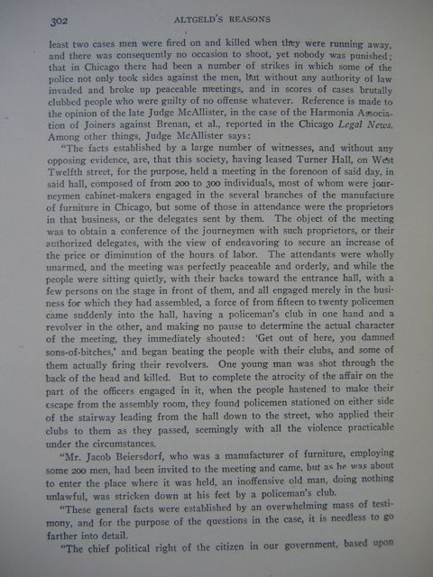 "The facts established by a large number of witnesses, and without any opposing evidence, are, that this society, having leased Turner Hall, on West Twelfth street, for the purpose, held a meeting in the forenoon of said day, in said hall, composed of from 200 to 3OO individuals, most of whom were journeymen cabinet-makers engaged in the several branches of the manufacture of furniture in Chicago, but some of those in attendance were the proprietors in that business, or the delegates sent by them. The object of the meeting was to obtain a conference of the journeymen with such proprietors, or their authorized delegates, with the view of endeavoring to secure an increase of the price or diminution of the hours of labor. The attendants were wholly unarmed, and the meeting was perfectly peaceable and orderly, and while the people were sitting quietly, with their backs toward the entrance hall, with a few persons on the stage in front of them, and all engaged merely in the business for which they had assembled, a force of from fifteen to twenty policemen came suddenly into the hall, having a policeman's club in one hand and a revolver in the other, and making no pause to determine the actual character of the meeting, they immediately shouted: 'Get out of here, you damned sons-of-bitches,' and began beating the people with their clubs, and some of them actually firing their revolvers. One young man was shot through the back of the head and killed. But to complete the atrocity of the affair on the part of the officers engaged in it, when the people hastened to make their escape from the assembly room, they found policemen stationed on either side of the stairway leading from the hall down to the street, who applied their clubs to them as they passed, seemingly with all the violence practicable under the circumstances.