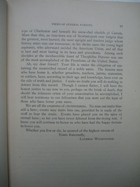 tops of Charleston and beneath the snow-clad citadels of Canada. More than this, no true-born son of Newburyport ever forgets that the greatest, most learned, the most upright and fearless judge whom history was our townsman; to his shrine came the young legal aspirants, who afterward molded the American Union, and all that is best and most lasting in its laws and precedents. Among such disciples at the inexhaustible fount of Theophilus Parsons was one of the most accomplished of the Presidents of the United States.