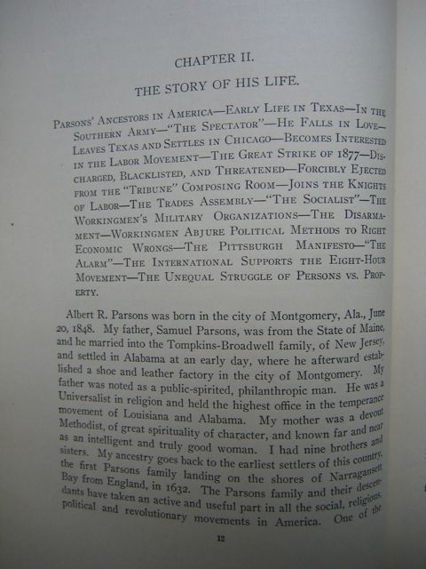 PARSONS ANCESTORS IN AMERICA—EARLY LIFE IN TEXAS—IN THE SOUTHERN ARMY—"THE SPECTATOR"—HE FALLS IN LIFE—LEAVES TEXAS AND SETTLES IN CHICAGO—BECOMES INTERESTED IN THE LABOR MOVEMENT—THE GREAT STRIKE OF 1877—DISCHARGED, BLACKLISTED, AND THREATENED—FORCIBLY EJECTED FROM THE "TRIBUNE" COMPOSING ROM—JOINS THE KNIGHTS OF LABOR—THE TRADES ASSEMBLY—"THE SOCIALIST"—THE WORKINGMEN'S MILITARY ORGANIZATIONS—THE DISARMAMENT—WORKINGMEN ABJURE POLITICAL METHODS TO RIGHT ECONOMIC WRONGS—THE PITTSBURGH MANIFESTO—"THE ALARM"—THE INTERNATIONAL SUPPORTS THE EIGHT-HOUR MOVEMENT—THE UNEQUAL STRUGGLE OF PERSONS VS. PROPERTY.